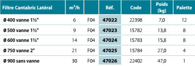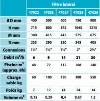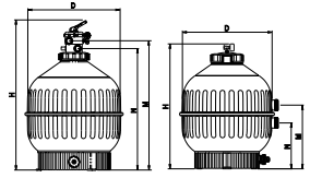 Bộ lọc trang bị 2 cát cống cắm "cho các mô hình Ø 750 mm và 900 mm, và 1 ½ "cho các mô hình Ø 400 mm, Ø 500 mm và Ø 600 mm.