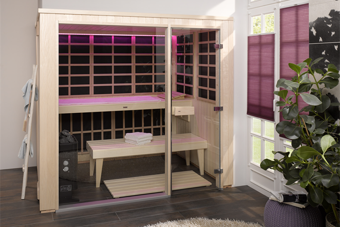 Phòng xông hơi khô Visage Vita để thư giãn lành mạnh, với nhiệt nhẹ của hồng ngoại - có thể được sử dụng để làm giảm căng thẳng hoặc làm nóng các cơ bắp hiệu quả trước khi tập luyện nhờ nhiệt độ lý tưởng của mình cho tim và tuần hoàn - visage VITA combi hồng ngoại tắm hơi xử lý cả kinh nghiệm tắm hơi đặc biệt tốt. Hơn nữa, kết hợp với thiết kế nội thất linh hoạt Kokoro, tắm hơi combi hợp thời trang này biến thành một cabin đa chức năng cho các bài tập phòng tắm hơi và yoga hồng ngoại.