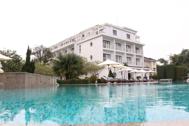 Xây dựng bể bơi nước mặn ở vị trí trung tâm khách sạn, hài hòa với những vườn cây xanh bao quanh.